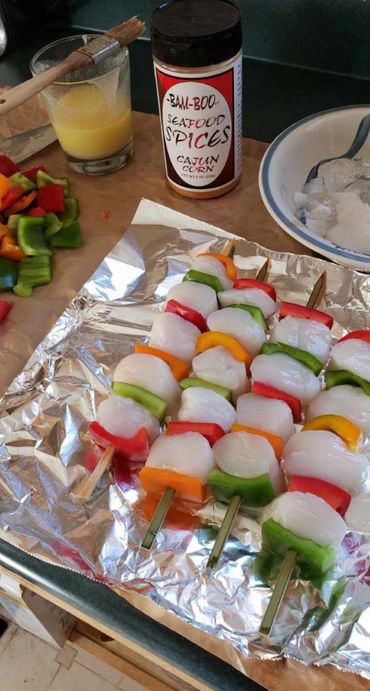 BBQ KABOBS TIPS 101: Soak wooden skewers at least 20 minutes. Thaw and drain seafood. Cut vegetables to approximately the same size as the meats (1 to 1.5 inches wide). Try to keep equal sizes of meat cuts so they cook at the same grill time. Large shrimp (21 to 30 count per pound), scallops or a thick cut of strong white meat fish like halibut, or swordfish work well. Thread the grain of the meat cross wise (+) to the flat skewer. Leave an inch at the ends of the skewers exposed for resting on the racks. Vegetables between each cut of seafood help hold the meat on the stick. Melt butter or use a cooking oil and baste the kabobs thoroughly. Try 1/4 cup of a seafood seasoning added to 3/4 cup Parmesan cheese (apply liberally). Place the HotRax on the grill the distance as shown in the pictures. Use grill mitts or a tool like a fork to adjust the distance of the hot front rack from the rear rack so the meat just fits between racks. Rotate kabobs for even cooking. Warning: Do not touch hot steel racks or skewers with bare skin. Try Hotrax Kabob Fingeraid to prevent burning fingers while turning kabobs.